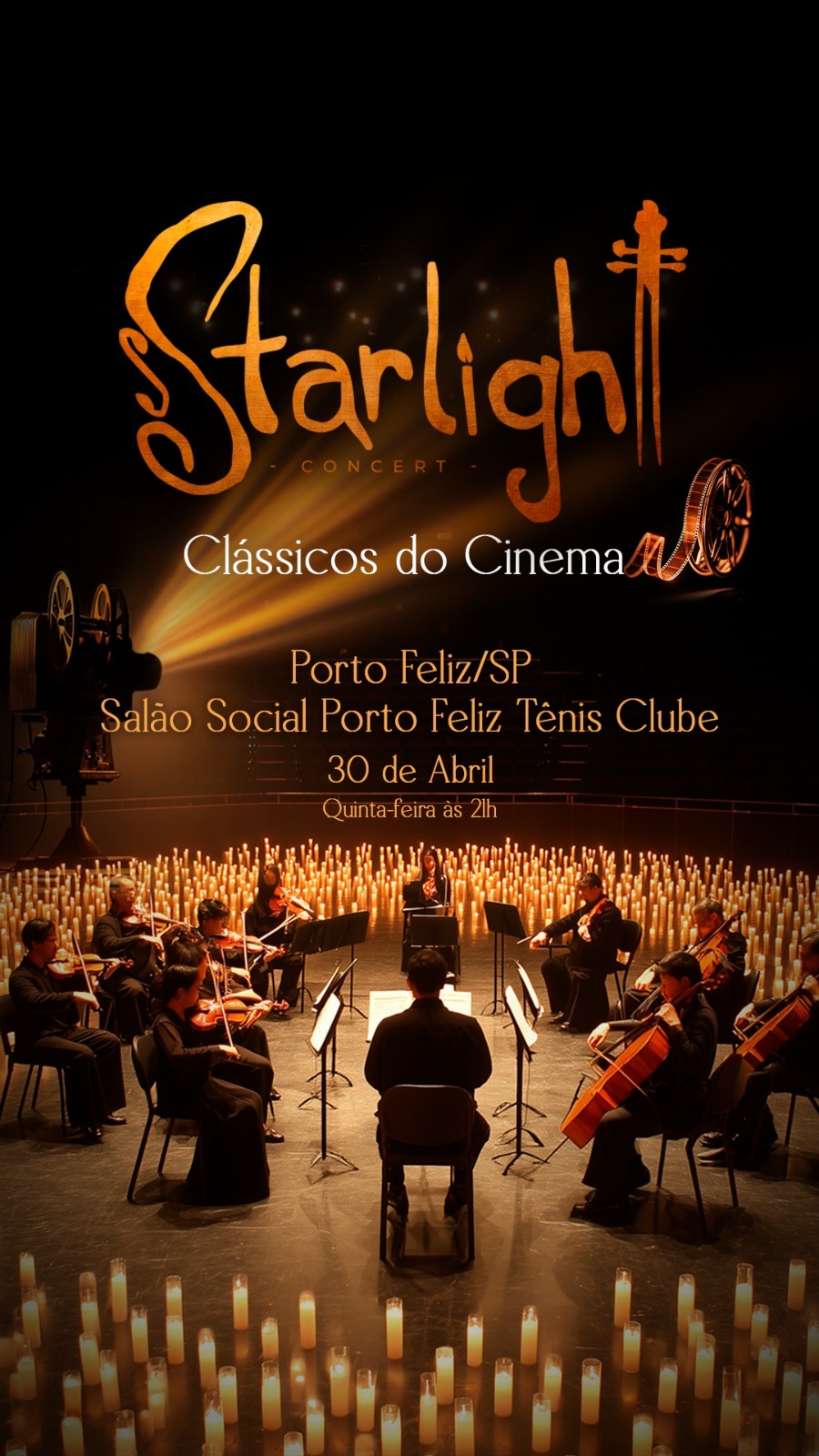 No dia 30/04, às 21h, o salão do Porto Feliz Tênis Clube será palco de um espetáculo emocionante com trilhas sonoras que marcaram o cinema! ✨🎻🎼