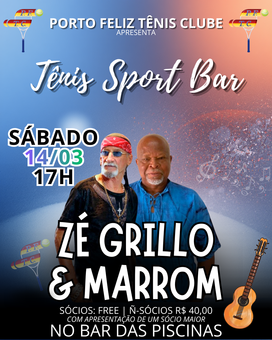 O Porto Feliz Tênis Clube apresenta o TÊNIS SPORT BAR com um super show de Zé Grillo & Marrom 🎤🎸